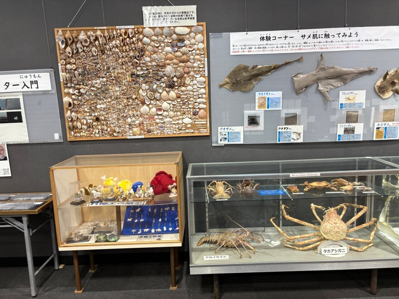 Inside, there's also an interactive area where you can learn by touch. By actually touching the rough texture of a shark's skin or observing a gigantic Japanese spider crab and colorful seashells up close, both children and adults alike became completely engrossed.