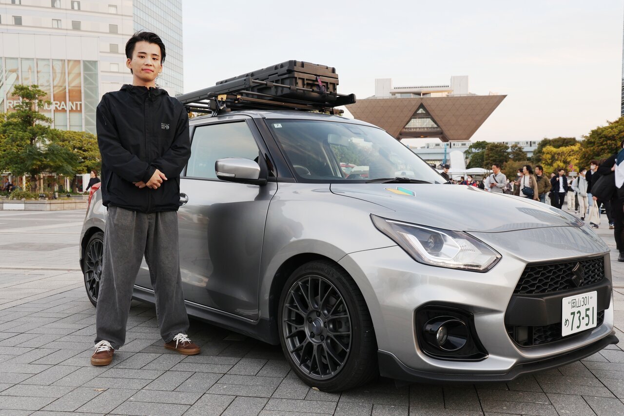 The car chosen by Takahito Yamashita (21), who studies film production at university, is the Suzuki Swift Sport. As a car enthusiast, he found that the Swift Sport fits his lifestyle, allowing him to enjoy driving while also carrying equipment (including a camera, lighting gear, and tripod). With a lifestyle that includes going camping with his gear, he appreciates that "it can be enjoyed outdoors, and the reliability and convenience of getting to filming locations suits me well."
