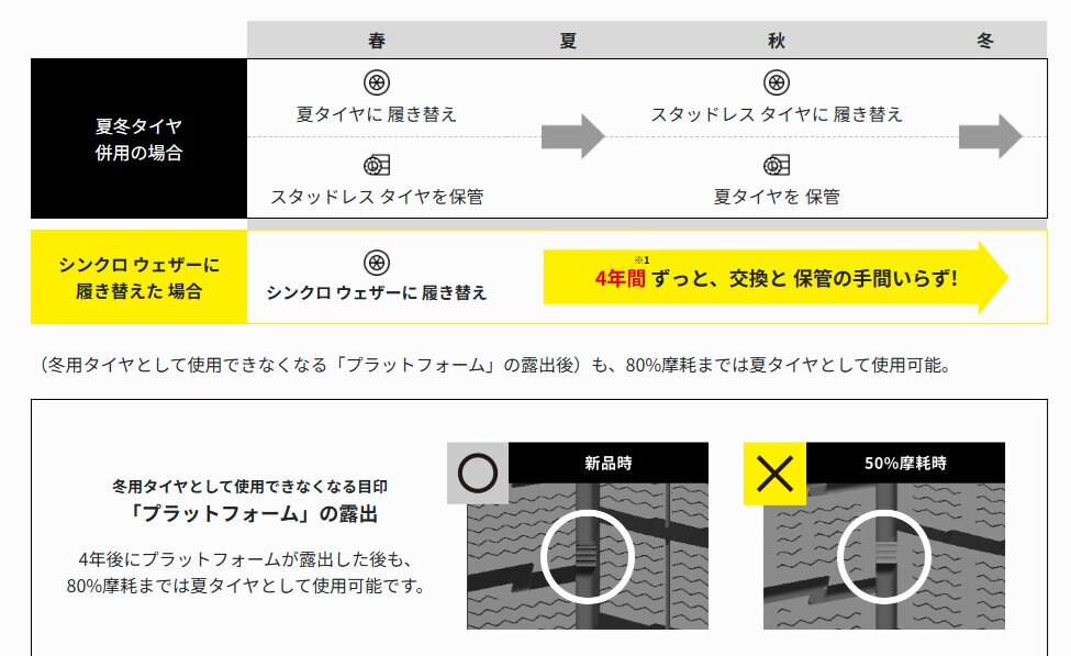 With Synchro Weather, you can use it for 4 years (※) without needing to change. Of course, there will be no hassle of swapping or storing during that time. After 4 years, even after the "platform" becomes exposed and can no longer be used as winter tires, it can still be used as summer tires up to 80% wear.