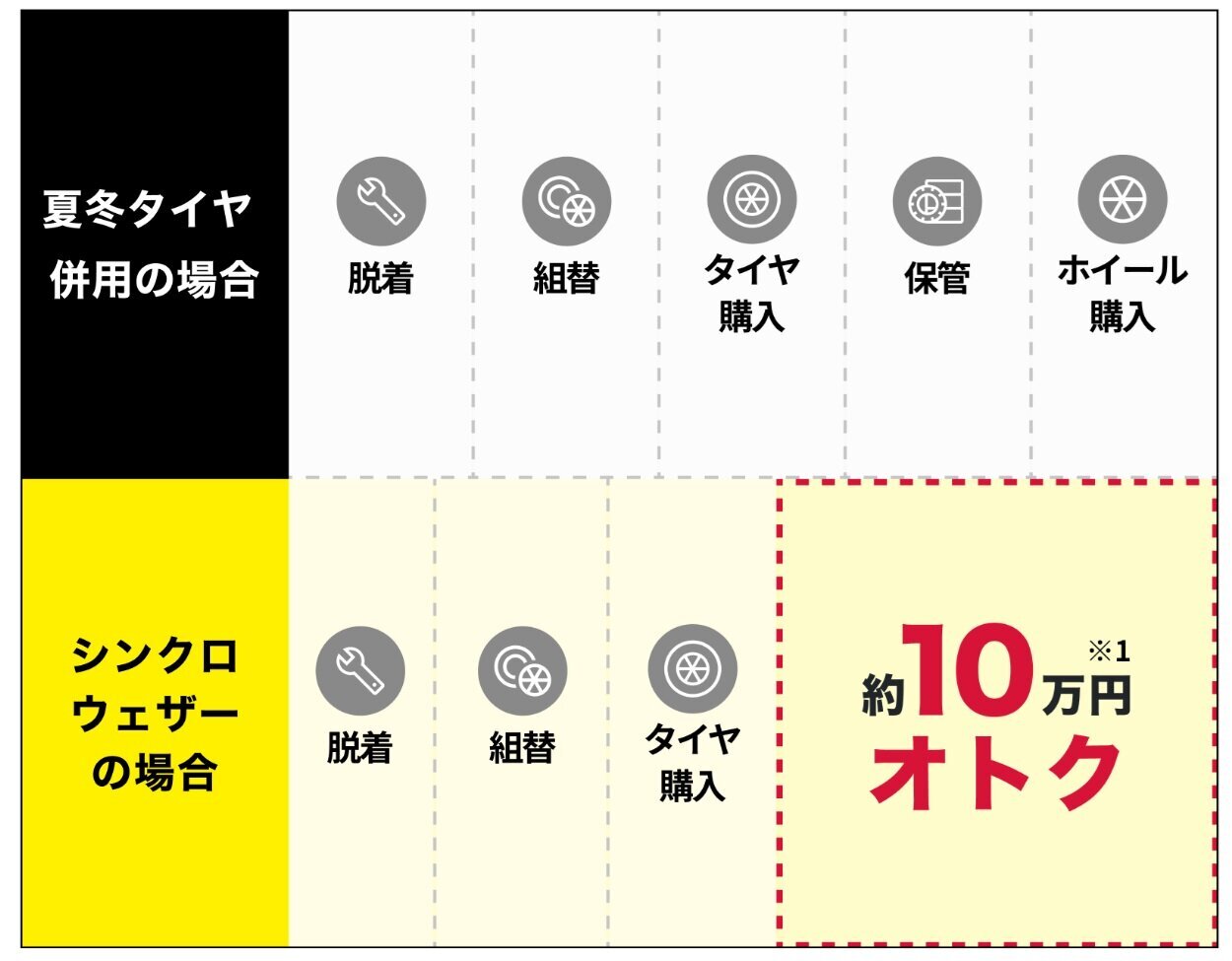 Let's look at a case that lasts just over 6 years, which is a bit longer than 4 years. When considering the case of "using both winter and summer tires" and "using SYNCHRO WEATHER," estimates show that with exchanges every 4 years, the SYNCHRO WEATHER can save about 100,000 yen in costs.