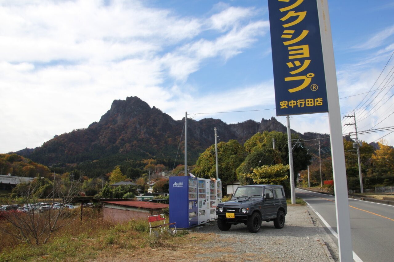 I took a snapshot of Mount Myogi and the Jimny at a Happy Drink Shop I passed by. The Happy Drink Shops, mainly found in Yamanashi Prefecture, serve as rest areas that combine inexpensive drink vending machines and drive-ins.