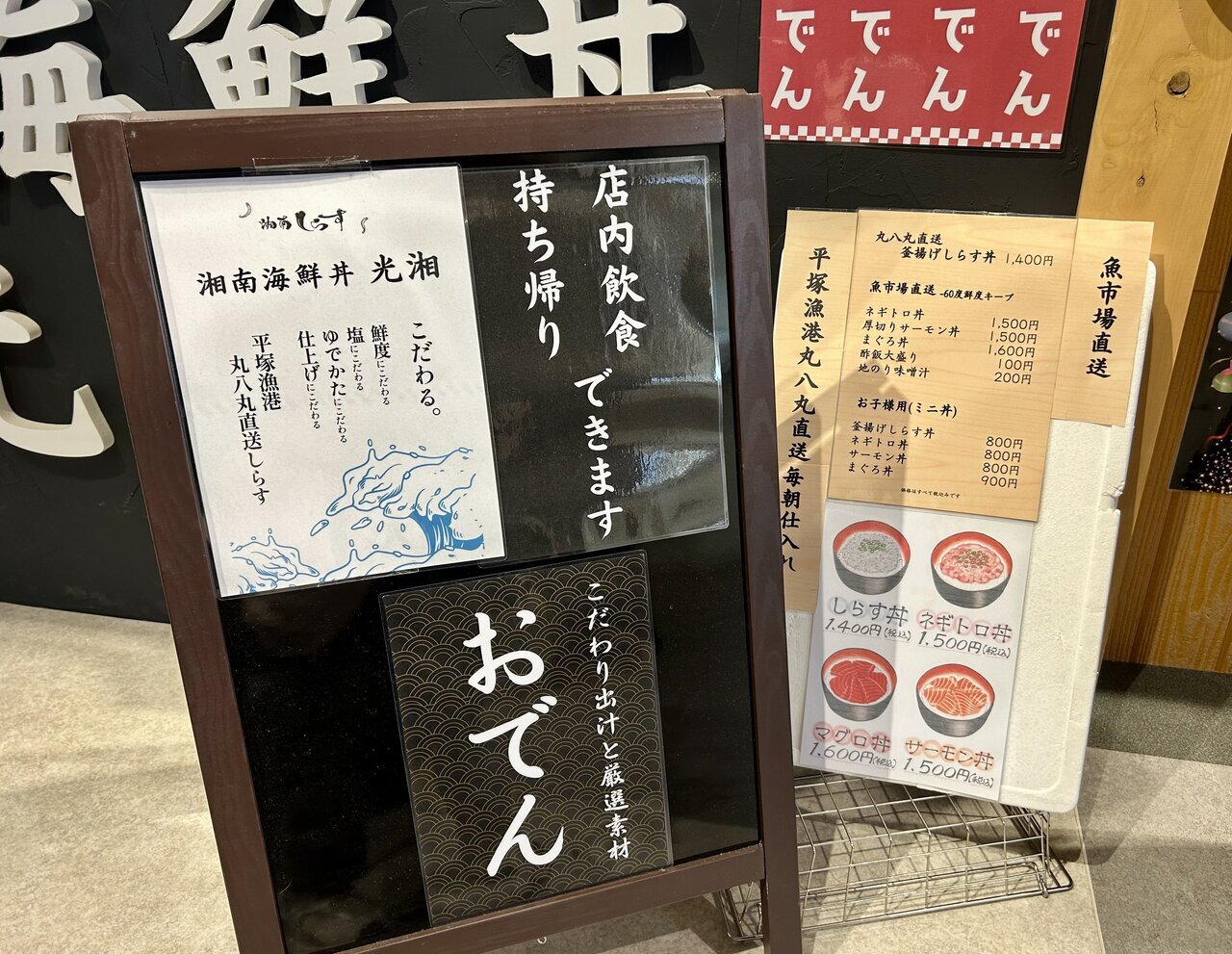 Inside the facility, there were a variety of shops, including a pork and egg specialty store and a takoyaki shop. Since we were in Shonan this time, we decided on the local specialty "shirasu-don"! According to the sign, it seems they use shirasu delivered directly from Hiratsuka fishing port, and it's one of their signature menu items.