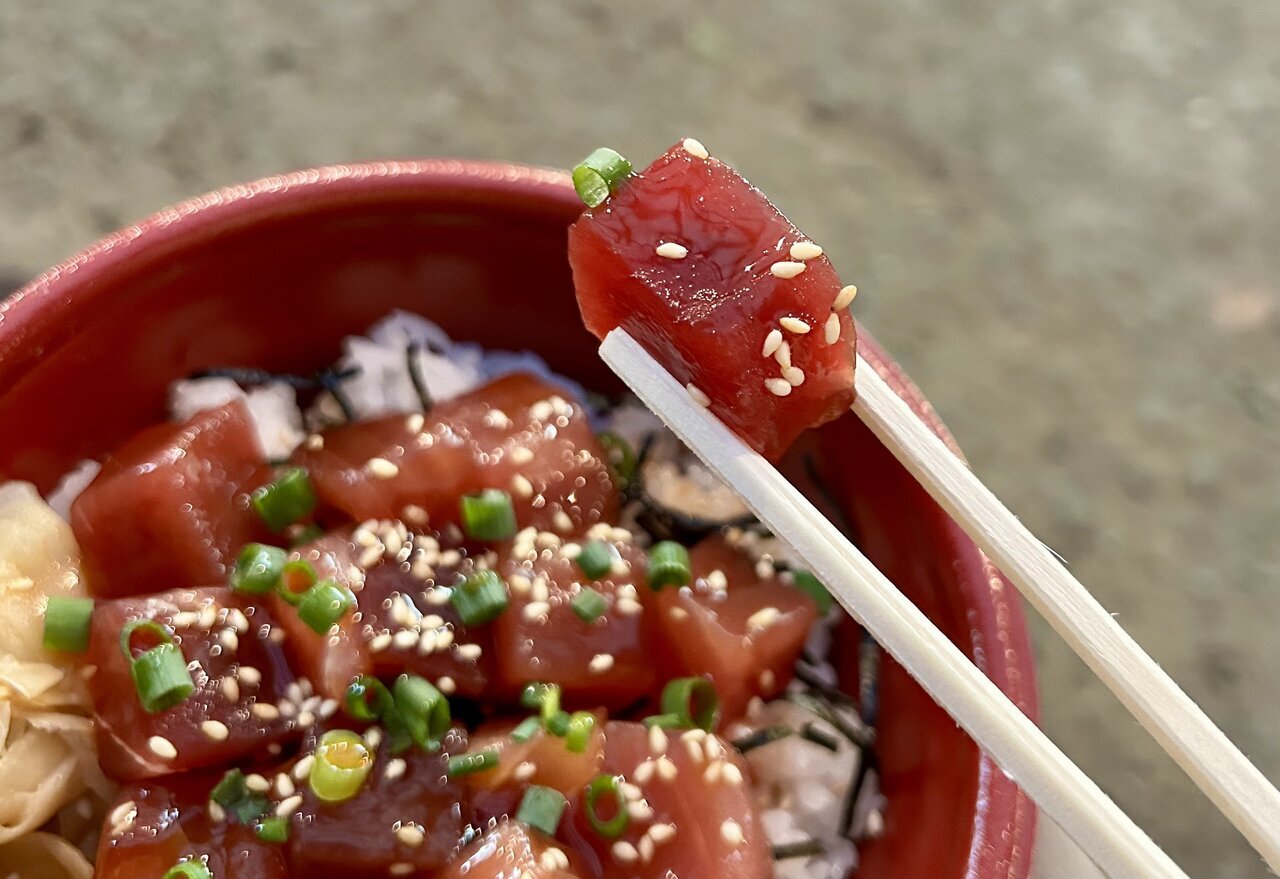 Since it's a takeout style, I enjoyed the tuna poke bowl at a table inside the venue. Generously cut pieces of tuna are lavishly placed on top of vinegared rice.