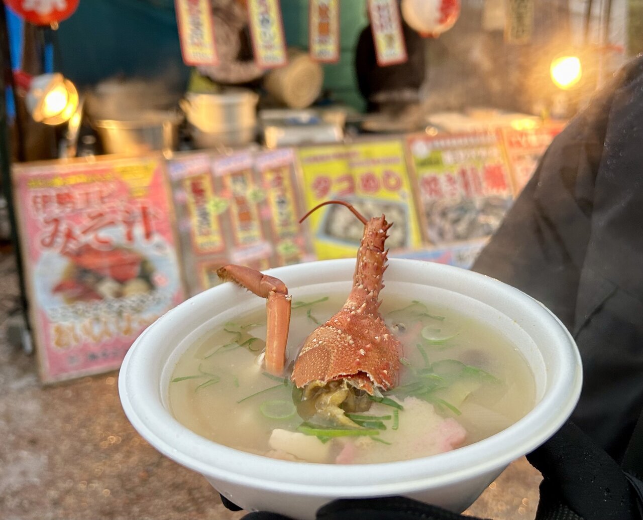 Finally, what I got was the "Ise Lobster Miso Soup" (600 yen) from Kaiwai Sakura-ya, lured by the steam. The rich broth from the Ise lobster seeps into my chilled body.