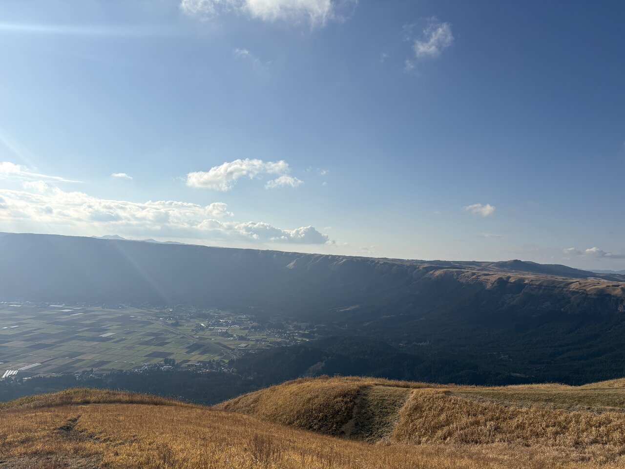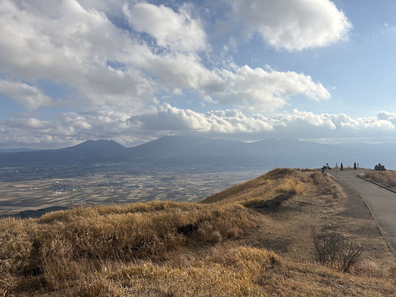 As I walked a little from the parking lot to the viewing space, the Aso valley suddenly came into view. With the five peaks of Aso in front, I could see the townscape and beyond that, the "Kujū mountain range."