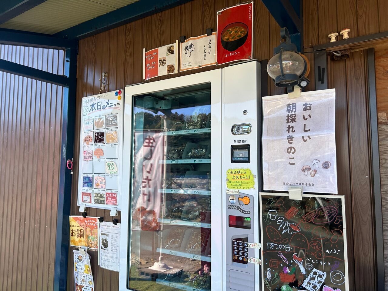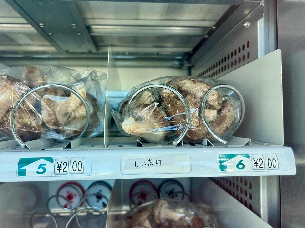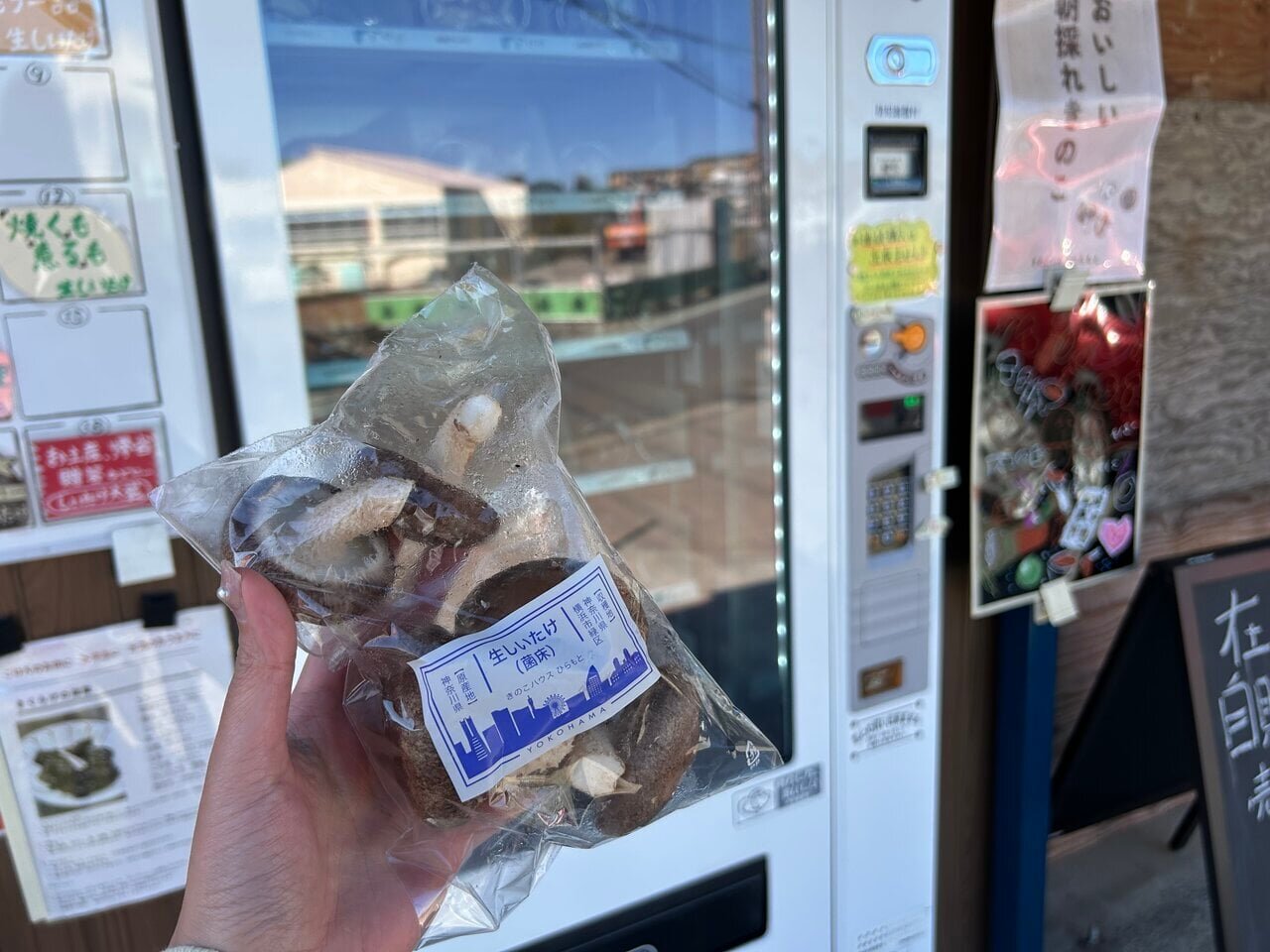 Oh! This is the "Mushroom House Hiramoto" that sells shiitake mushrooms from a vending machine. When I arrived, locals were lining up. According to word of mouth, there are times when they sell out in the morning.
