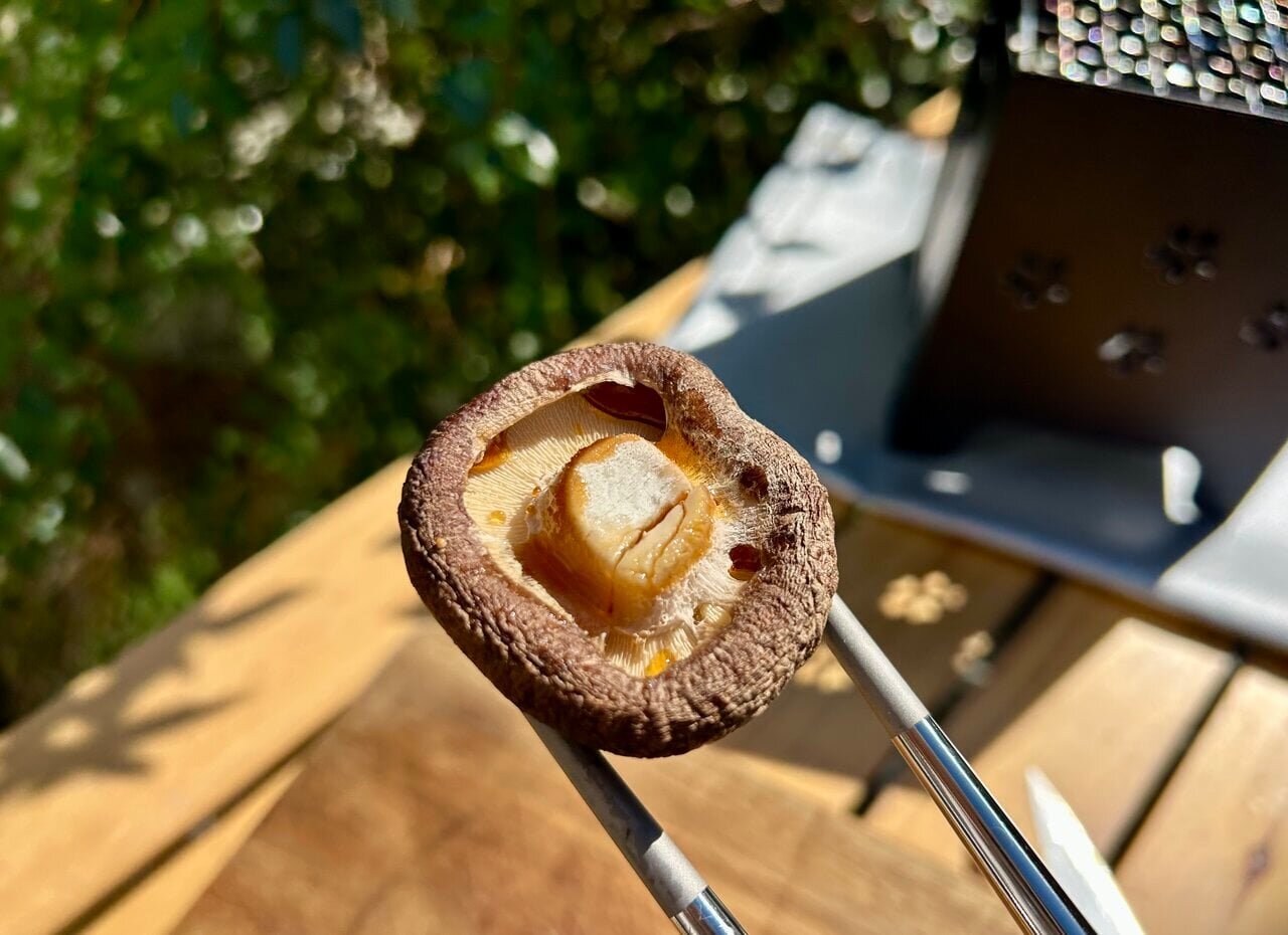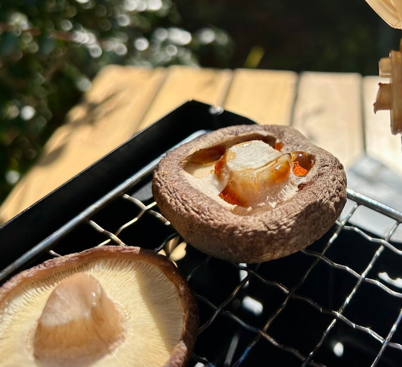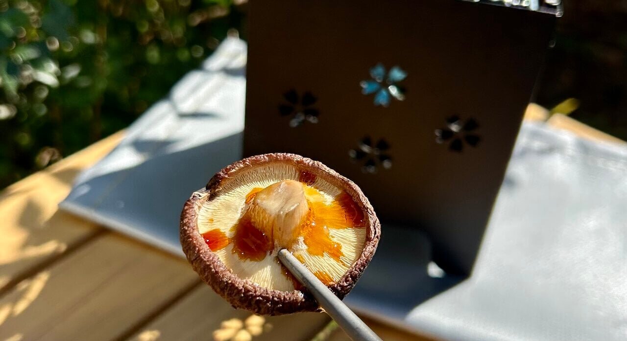 Cut off the stalk and slowly grill it on the stove. I heated the "micro stove" from Daiso with solid fuel. When moisture started to accumulate inside the cap, it was just right; I drizzled a small amount of soy sauce for finishing and tried it.