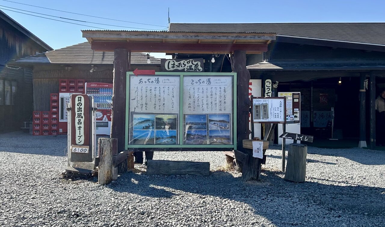Maybe it's due to the unique openness of the outdoor setting and its rustic atmosphere, but I felt a vibe reminiscent of a mountain lodge at this hot spring. As I walked in, a large sign caught my eye. Oh, so "Hottarakashi Onsen" has "Achichi no Yu" and "Kocchi no Yu."