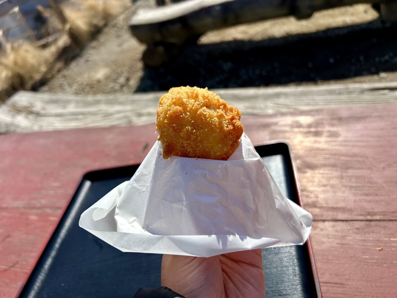 Then, I eagerly took a bite of the “hot spring egg tempura” (200 yen). This... is delicious! The crispy texture of the batter is great, and the yolk bursts out, spreading rich flavor and the deliciousness of the egg in my mouth. The salty taste is just right, satisfying what my body craved after the hot spring. It was so delicious that I ended up buying another one on the way back.