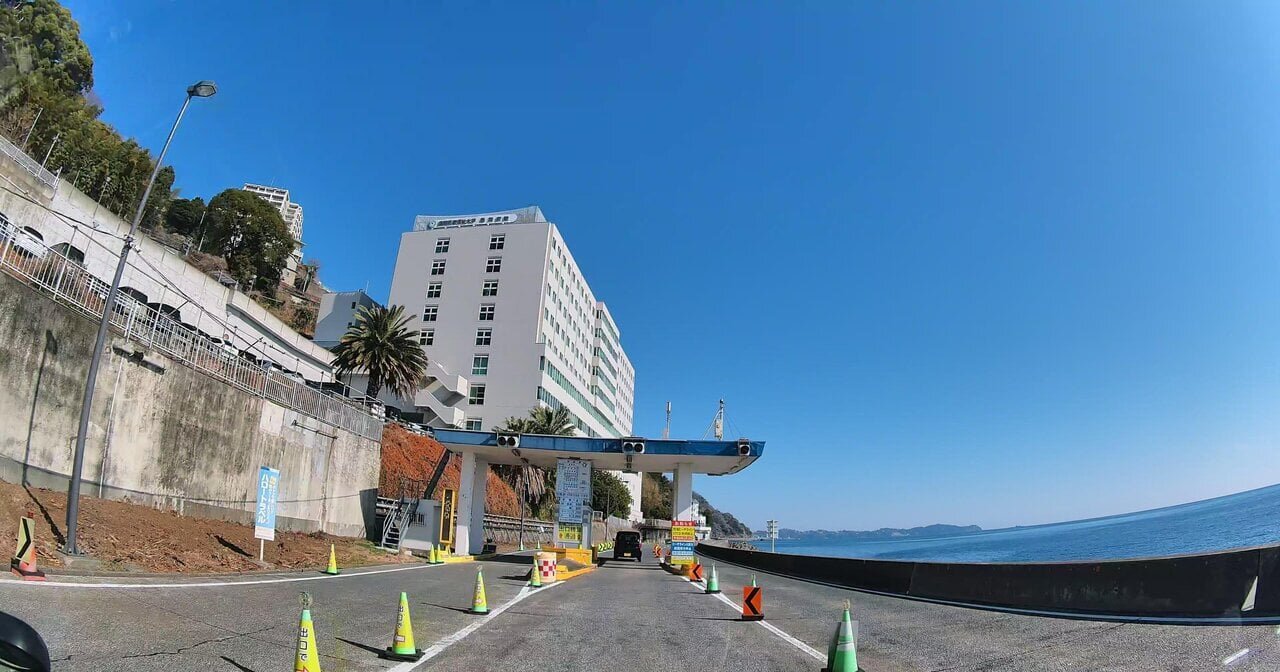 We have arrived at the Atami Beachline tollgate. We didn't pay at the entrance, but here we pay 500 yen (for light/passenger vehicles). The intersection ahead is the turnaround point.