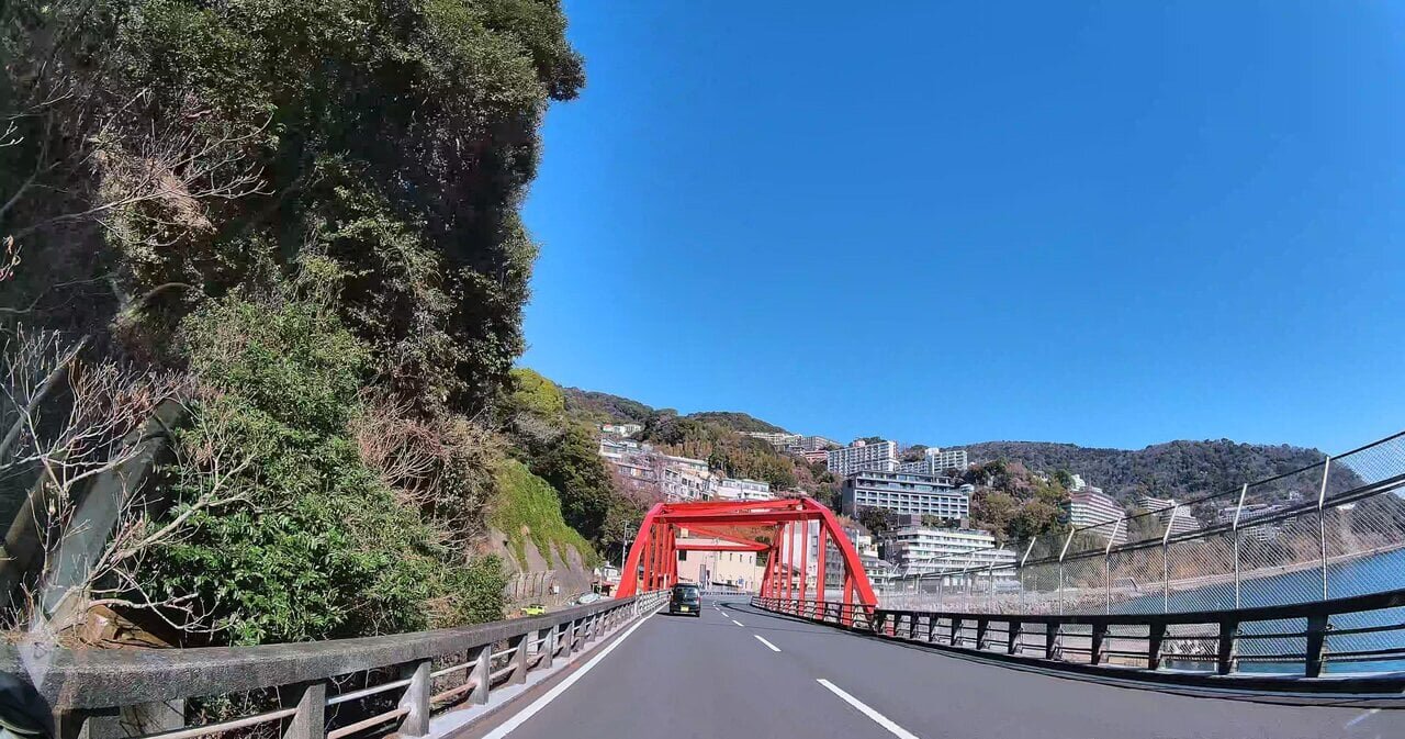 An impressive red bridge is visible as soon as you start. There are similar bridges in the Peninsula Manazuru, and the red arch that matches the coastal scenery is charming. It was my first time driving on the Atami Beach Line, and it is a very beautiful and pleasant route.