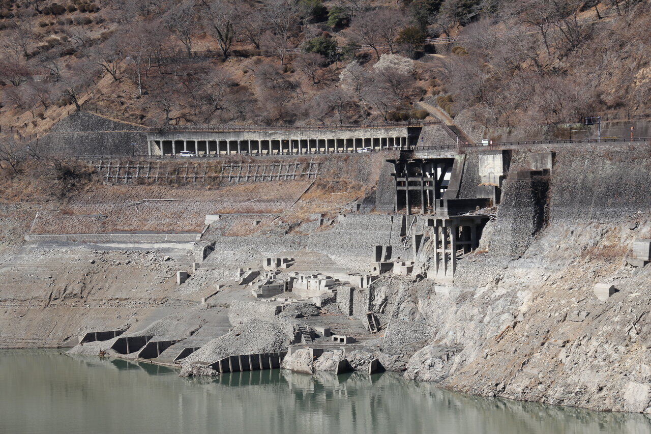 Due to the recent low precipitation levels, submerged structures in various dams have become visible again and are attracting attention. Last time I visited the old road at the Miyagase Dam, but this time I'm driving to see the remnants of the quarry at Ogouchi Dam (Okutama Lake).