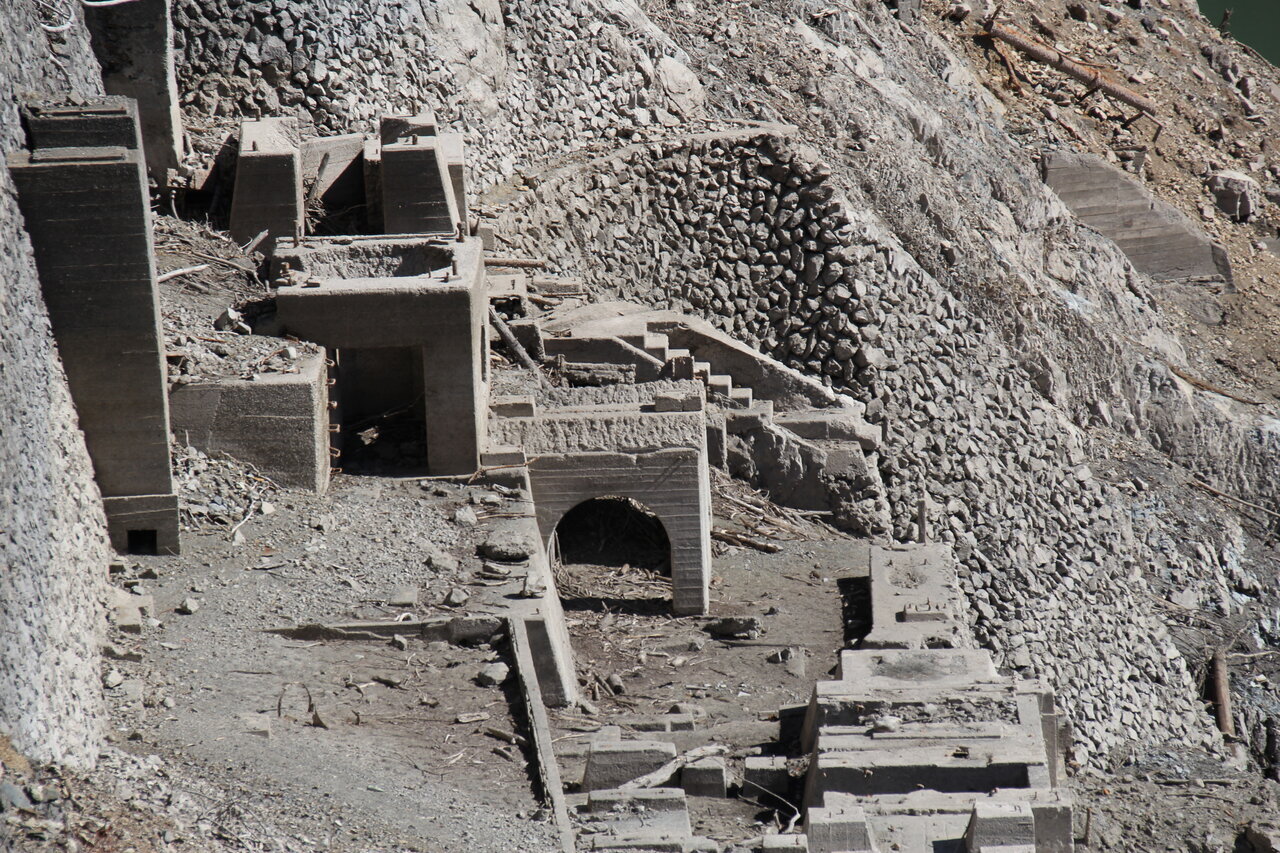 The structures that emerged due to the drought are remnants of a quarry that was used for construction. The history of the construction of the Okauchi Dam goes back a long way; it began in 1938 but was suspended five years later due to the intensification of the Pacific War. Construction resumed in 1948, and there is a difficult history of concrete pouring that continued for about nine years from that point.