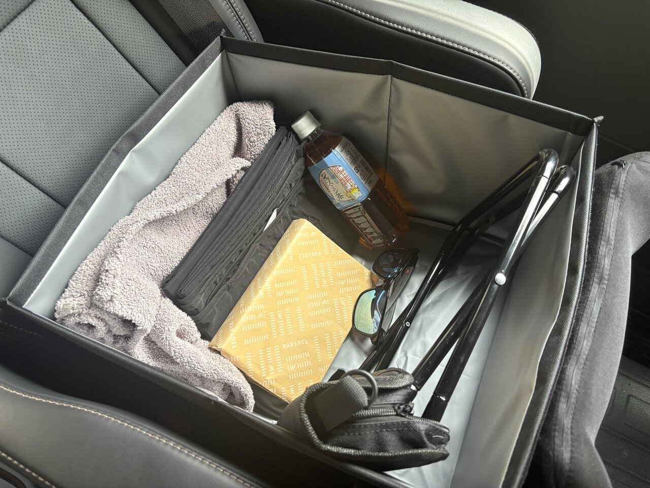 It looks different from the cushion above, but when you expand the box part, it holds so much. What I included were a folding chair, leisure sheet, blanket, sunglasses, a book, and tea. By consolidating what had previously been scattered, the back seat became neat and tidy. What I particularly felt was the aspect of "not needing to prepare for the next use."