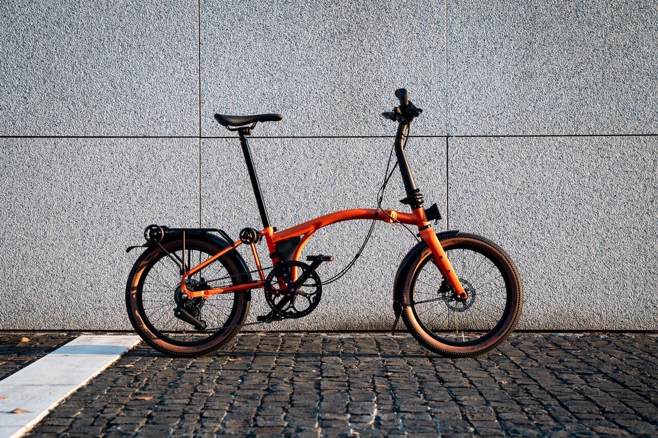 The "Brompton G Line" is a folding bicycle designed for rough terrain like an MTB. It features large 20-inch wheels, puncture-resistant tires, and is equipped with Brompton's first hydraulic disc brakes, making it tough for off-road use. The colors available are Adventure Orange, Forest Green, and Rail Dust White, all of which are easy to incorporate.