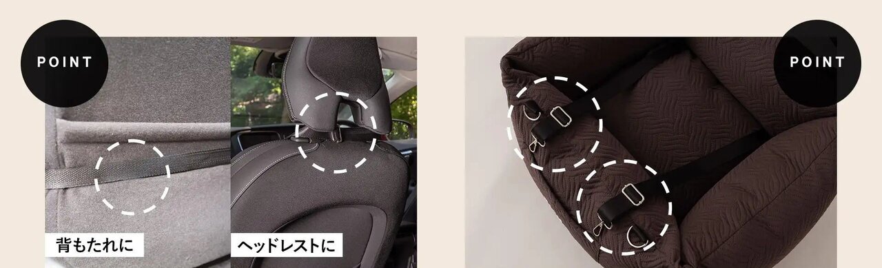 Equipped with two fixing devices at the top and bottom that can be firmly attached to the seat. It is supported at two points—the backrest of the seat and the headrest—so it is less likely to shift during driving and offers excellent stability. It comes with two safety leads to prevent jumping out. Even if you place two pets together in the drive bed, you can connect each one with a lead, allowing for safe use.