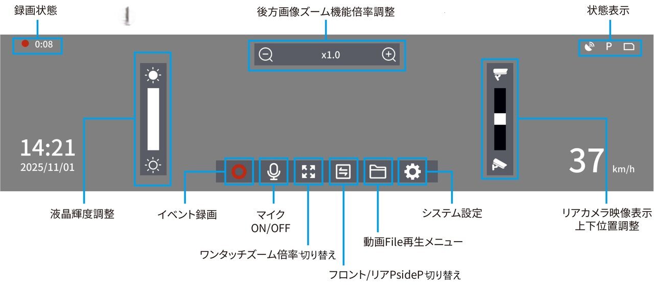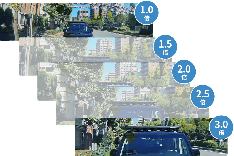 The front camera has a diagonal angle of 134°, and the rear camera has a diagonal angle of 130° and wide angle. It can effectively capture blind spots, which will be useful for safety checks during right and left turns and lane changes. The magnification of the rear view image can be adjusted in five stages from 1 to 3 times, allowing for confirmation at a distance similar to that of an analog mirror.