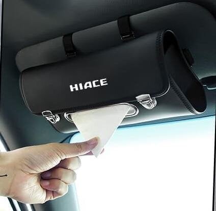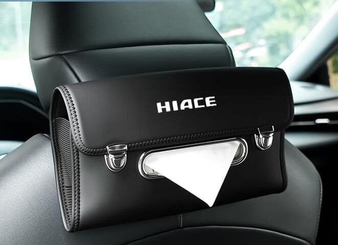 This is a tissue case specifically designed for the Hiace that I found. Made of elegant black leather, it instantly elevates the atmosphere of the car interior. Your regular tissues transform into a luxurious interior accessory!