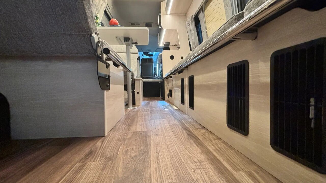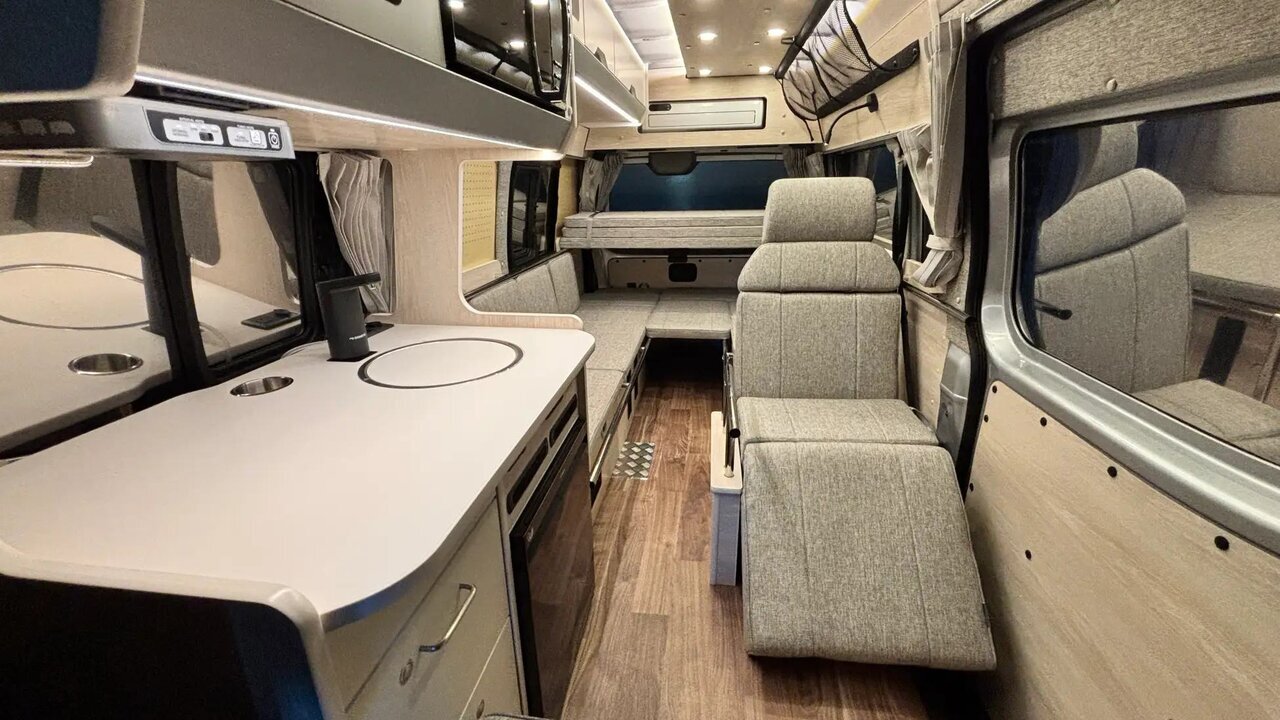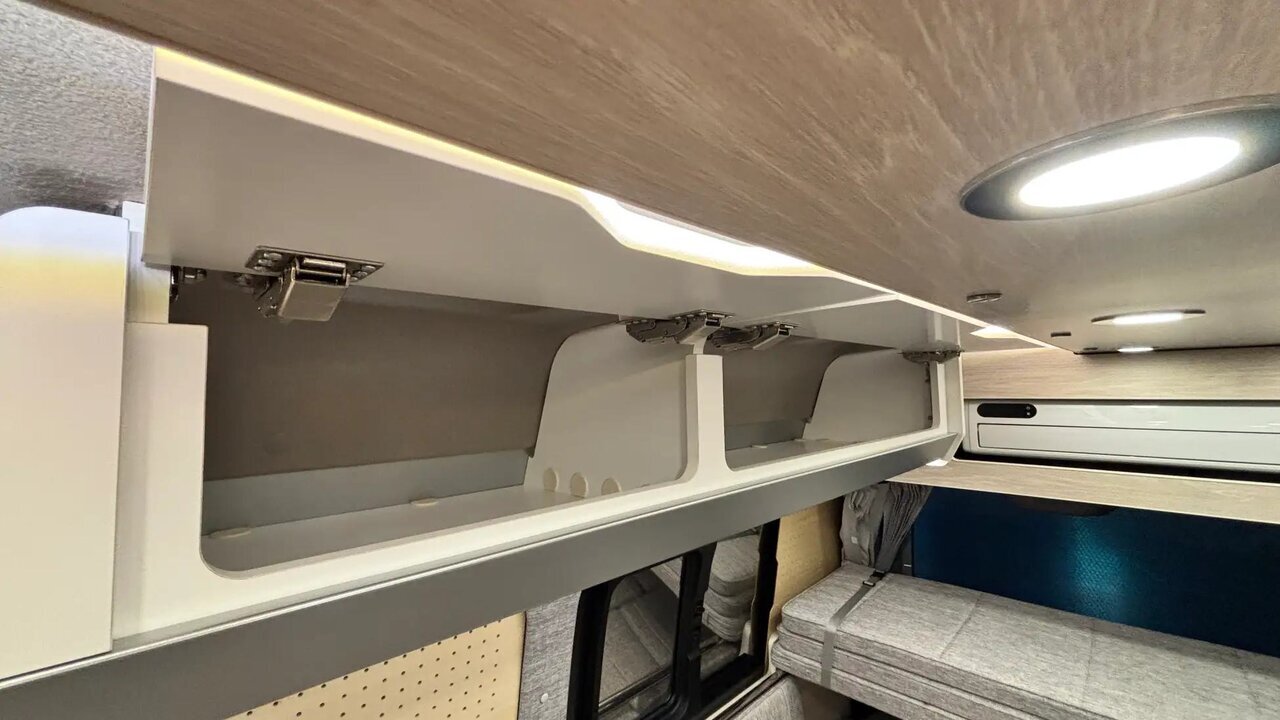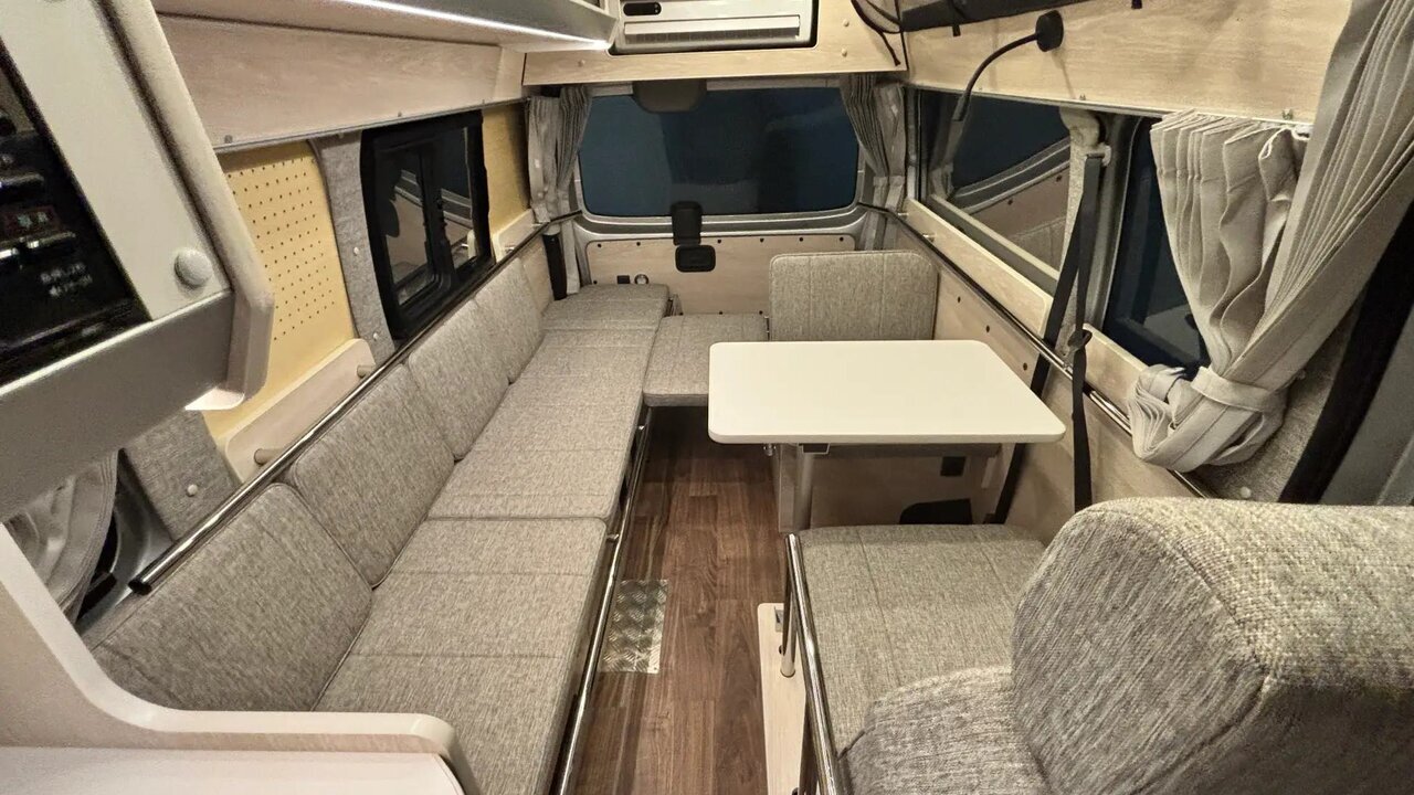 Above the sideways three-seat, there is a storage shelf that allows organized storage of clothes and small items. It has also been made easier to load long items like skis and fishing rods. Under the third seat, a portable toilet can be stored, making it reassuring for trips with children. The electrical equipment is also well-equipped, making it perfect for long family trips.