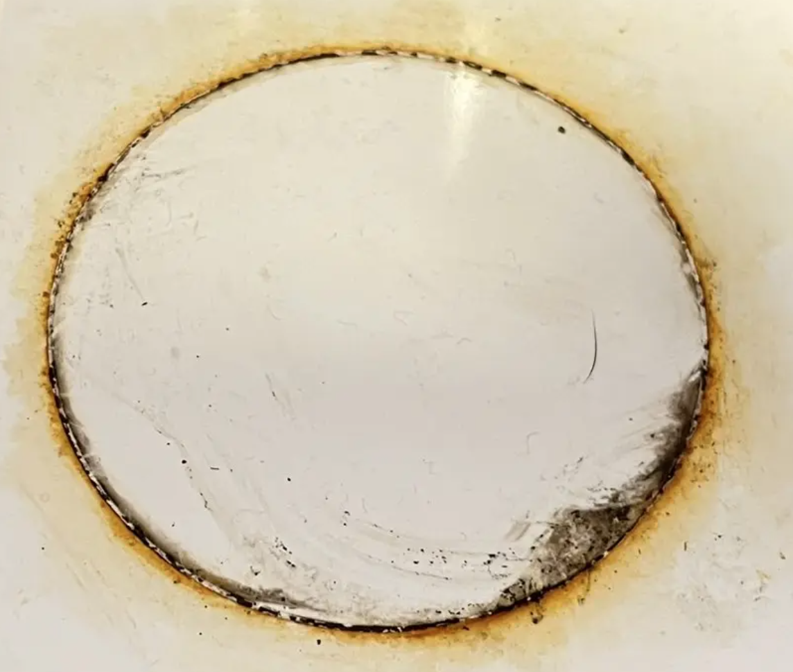 Rust stains from hair spray that have adhered to the washbasin. Once it sticks this much, it doesn't easily come off even with scrubbing.