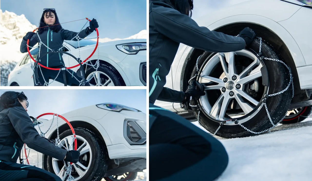 Automatic tensioning and 9mm chains provide solid grip even on snowy roads.