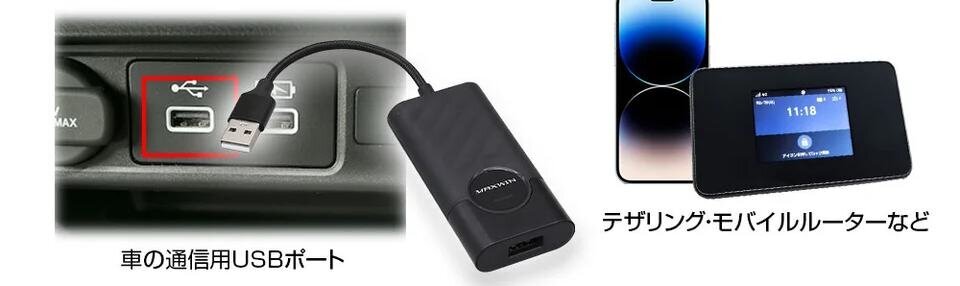 Simply connect to the USB port for easy usage. You can connect via smartphone tethering, in-car Wi-Fi, or mobile routers. By inserting a USB memory stick, you can play videos and music even offline, so there's no worry about data limits or being out of signal range. If the operation is unstable, you can use the included USB power assist cable to supply power from both the communication and charging USB ports.
