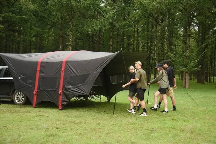 The back door section of the tarp can connect to the rear gate of the car. It accommodates a wide range of vehicles from SUVs to minivans, designed to allow movement without getting wet on rainy days. It gently connects the sleeping area in the car with the living area under the tarp. On rainy days, you can easily take out your belongings from the car and move them directly to the sheltered area without worrying about getting wet.