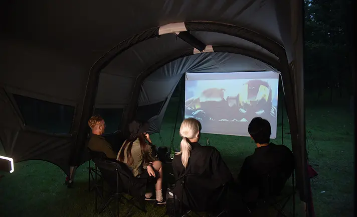 Equipped with six insect mesh windows on both sides, it allows airflow while blocking insects. If you hang the included projector screen inside, the nighttime site transforms into a movie theater.