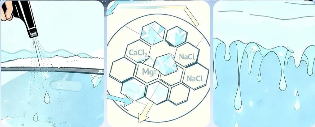 The secret to de-icing lies in the chloride components contained in the spray liquid. The ions quickly penetrate the surface of the ice, disrupting the crystal structure.