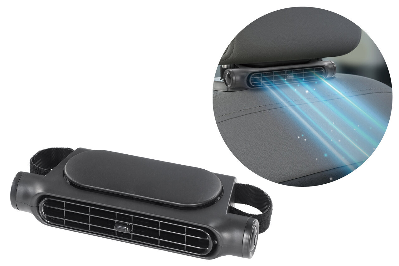 The "USB-Powered Car Slim Headrest Fan" makes the in-car environment comfortable even during the hot summer season. When attached to the headrest, it blows air to the driver's neck and back. By directing the airflow outlet the other way, it is also possible to provide airflow to the back seat.