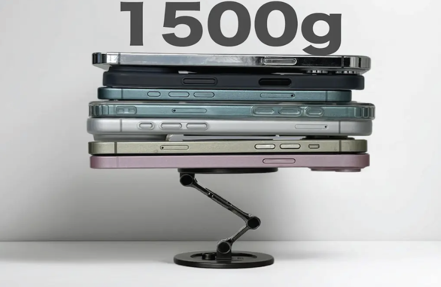 With a high-torque structure employing a 5mm diameter super thick rotating shaft, the holding power has drastically increased. It securely maintains the angle, not only for smartphones but also for heavier devices like tablets and PCs, making it resistant to bending.