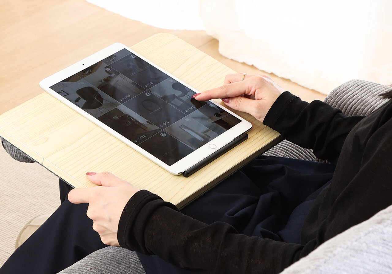 The "lap table that can be used anywhere" is a table that creates a workspace easily just by placing it on your lap. It allows you to create a comfortable environment without being restricted to a specific location, from work during breaks out on the road to lunchtime. Additionally, the ability to adjust its direction according to where you are using it or your posture is also a helpful point.