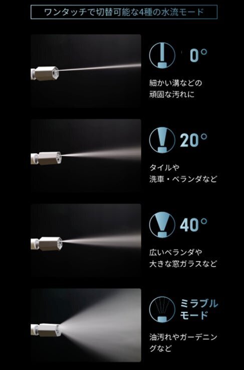 With a maximum water pressure of 3.5MPa, it has professional-grade power. The water flow mode can be switched with a single touch, allowing for four different applications. It seems that even mud stuck to the undercarriage, wheels, and tire housings can be easily removed.
