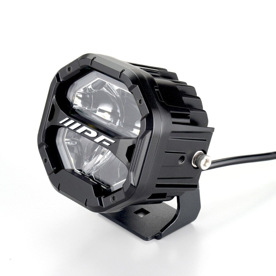The IPF "S-880ML 4-inch Octagon DR-ML" is an off-road lamp featuring a mechanical octagonal design that is currently popular in North America. The aluminum die-cast guard rim, which prominently displays the IPF logo, protects the light body while providing a rugged presence.