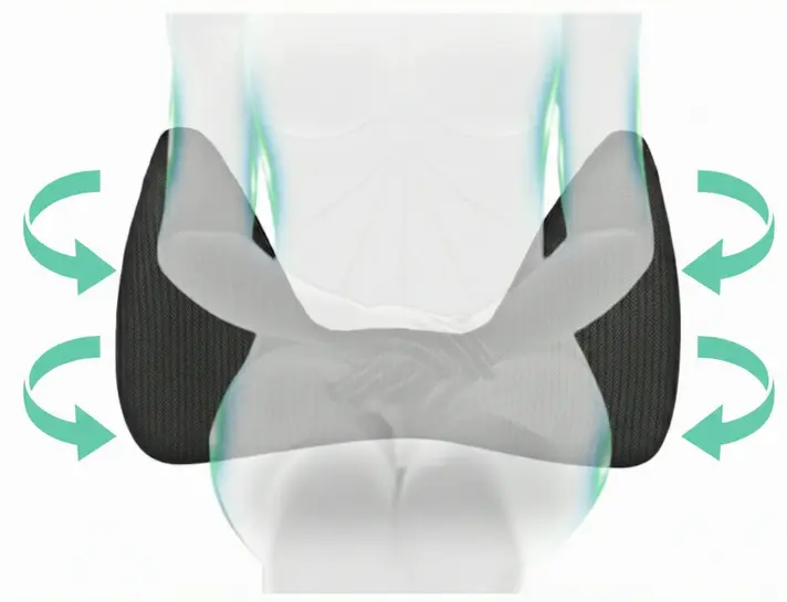 By preventing the pelvis from tilting forward, the spine naturally maintains its S-curve, distributing the load focused on the lower back. Adjusting the thickness of the back cushion inhibits forward bending and slouching, promoting a comfortable posture with an open chest. The neck support can be finely adjusted in height to match the headrest, relieving tension around the neck.