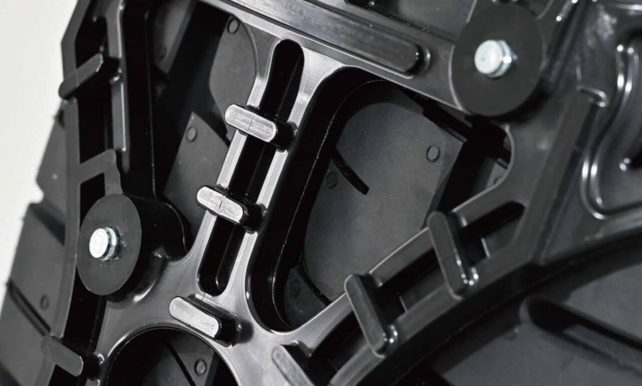 The Easy Fit series features a "3D Fit = three-dimensional structure" that closely adheres to the tire shape. Instead of the chain impacting in a flat manner, the design wraps around to match the curvature of the tire, enhancing the stability of the contact surface.