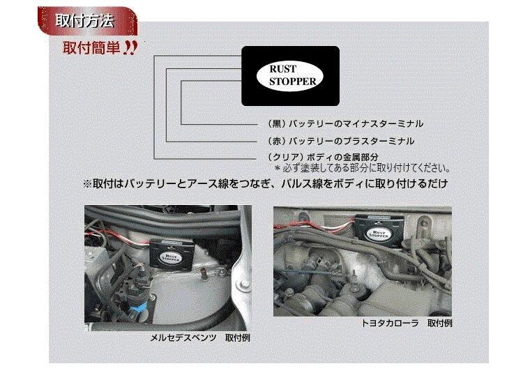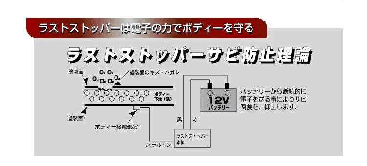The greatest feature of Rust Stopper is that it optimizes the technology of "electrolytic corrosion protection," based on scientific evidence, specifically for automobiles. The cause of metal rusting is the reaction with moisture and oxygen, which leads to a loss of electrons and oxidation. Rust Stopper continuously compensates for the lack of electrons by intermittently supplying a weak current from the battery to the entire body.