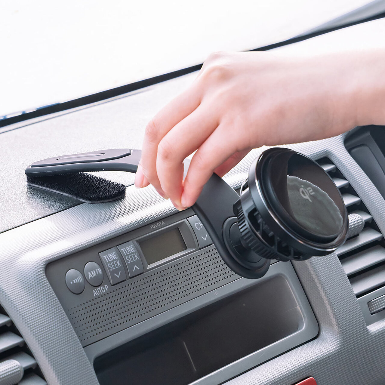 The installation uses a hook-and-loop pad. It firmly secures to dashboards and other surfaces while allowing for easy removal when not needed, reducing worries about marks or sun damage. Even smartphones that are not compatible can be used by utilizing the included metal ring.