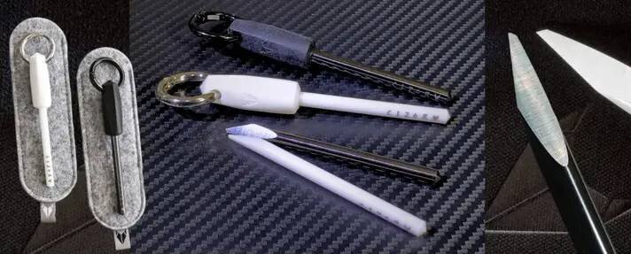 The "CERACIZOR" is a compact tool designed for self-escape in emergencies such as when doors won't open or seatbelts won't release. By striking the tip against glass, it can break side windows and cut seatbelts or strap materials with its edge. Features considering scenarios like being trapped in a car during floods or when the vehicle's body is deformed in an accident are integrated into one tool.