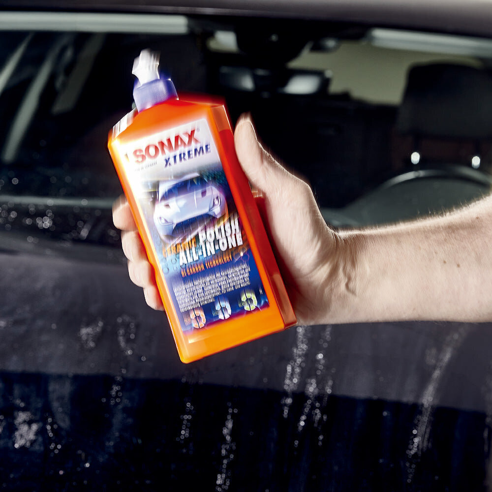 A revolutionary polish agent, "SONAX Extreme Ceramic Polish All-in-One," efficiently removes fine scratches and water stains accumulated on the body while simultaneously providing ceramic protection.