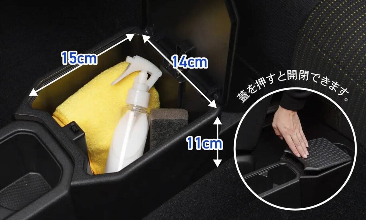 Just place it in the center of the footwell of the second row seats, and you can hold two drinks. Additionally, it comes with a storage compartment about 11cm deep, allowing even small items that tend to clutter to be stored neatly. The box has a one-touch opening and closing lid, so no dust gets inside, which is a plus.
