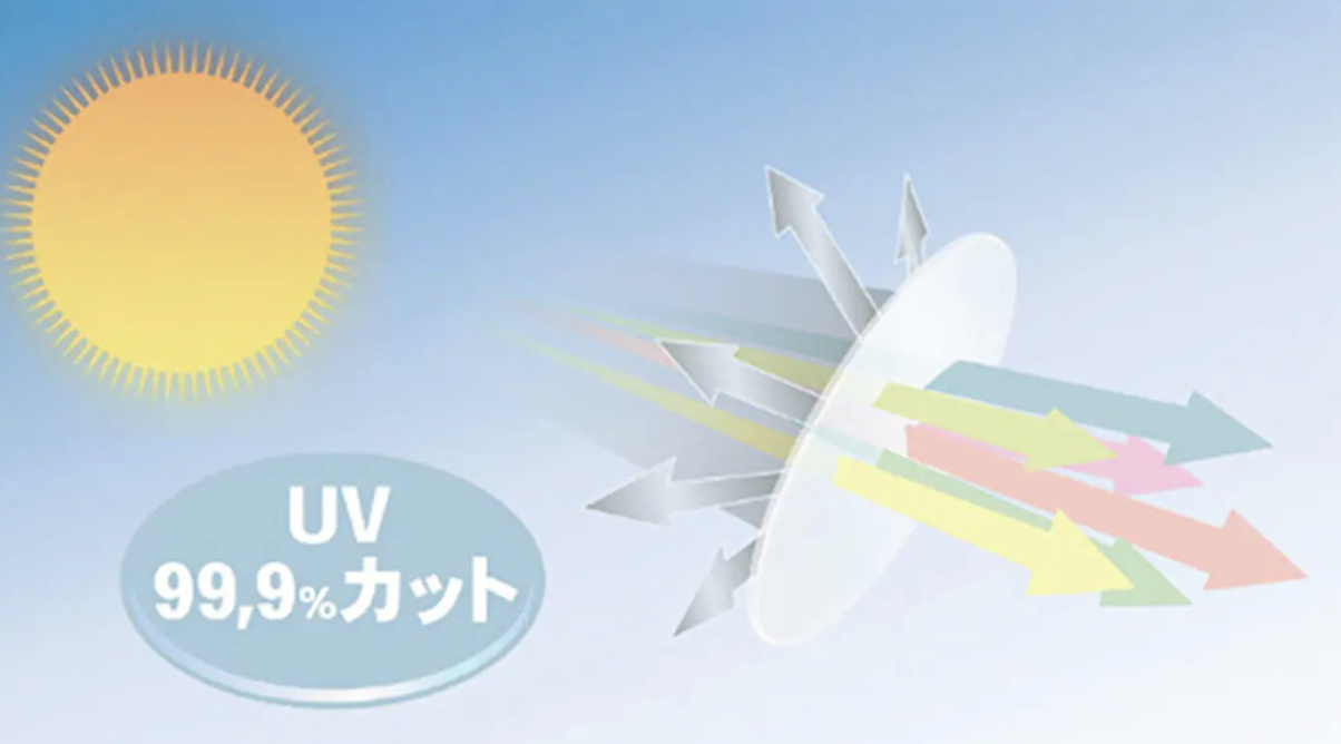 They cut over 99.9% of UV rays, maintaining a more natural view. Since UV absorbers are embedded in the lens itself, the UV-cut function continues even if the surface becomes scratched. They are effective not only in driving scenes but also in sports and outdoor activities.