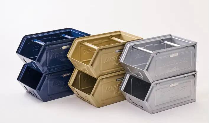 A stackable storage box, the "Parts Stocker LC Edition." This storage box is easy to access and beautifully organizes tools and camping gear. It features a collaborative original design that combines an embossed logo with an embedded plate, conveniently available in three exclusive colors that faithfully reproduce the colors used in the Land Cruiser 70.