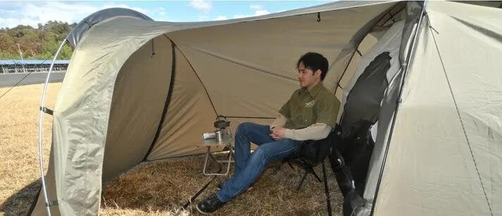 The new "Maehiro Dome E" from Daytona Maehiro Dome, supported by camping and touring enthusiasts. Its biggest feature is the spacious front room, allowing not only for relaxation with chairs and tables but also smooth access even when placing gear like helmets, touring bags, or boots. It offers ample living space that doesn’t feel cramped, which is often the case with solo camping.