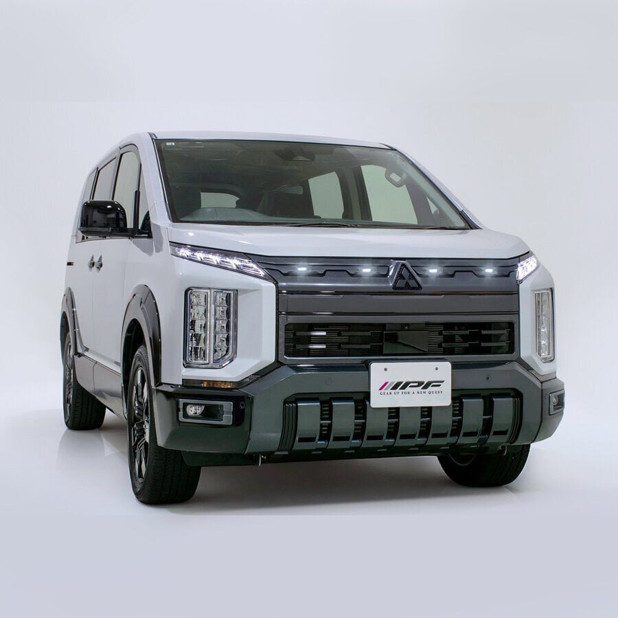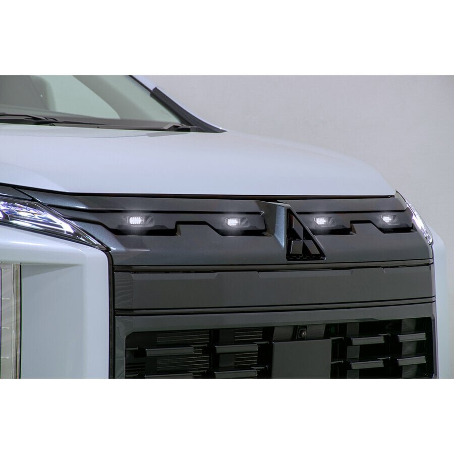 IPF's new product "Grill Marker for Delica D:5 WH TYPE2 (EXD-06W)." With a fit that only a dedicated design can provide, it achieves a sense of unity that feels just like an original option. During installation, the decorative part (silver) attached to the grill needs to be removed and partially cut, but since it comes with a bezel (frame), any slight enlargements in the processing holes can be neatly covered, so there's no need to worry.