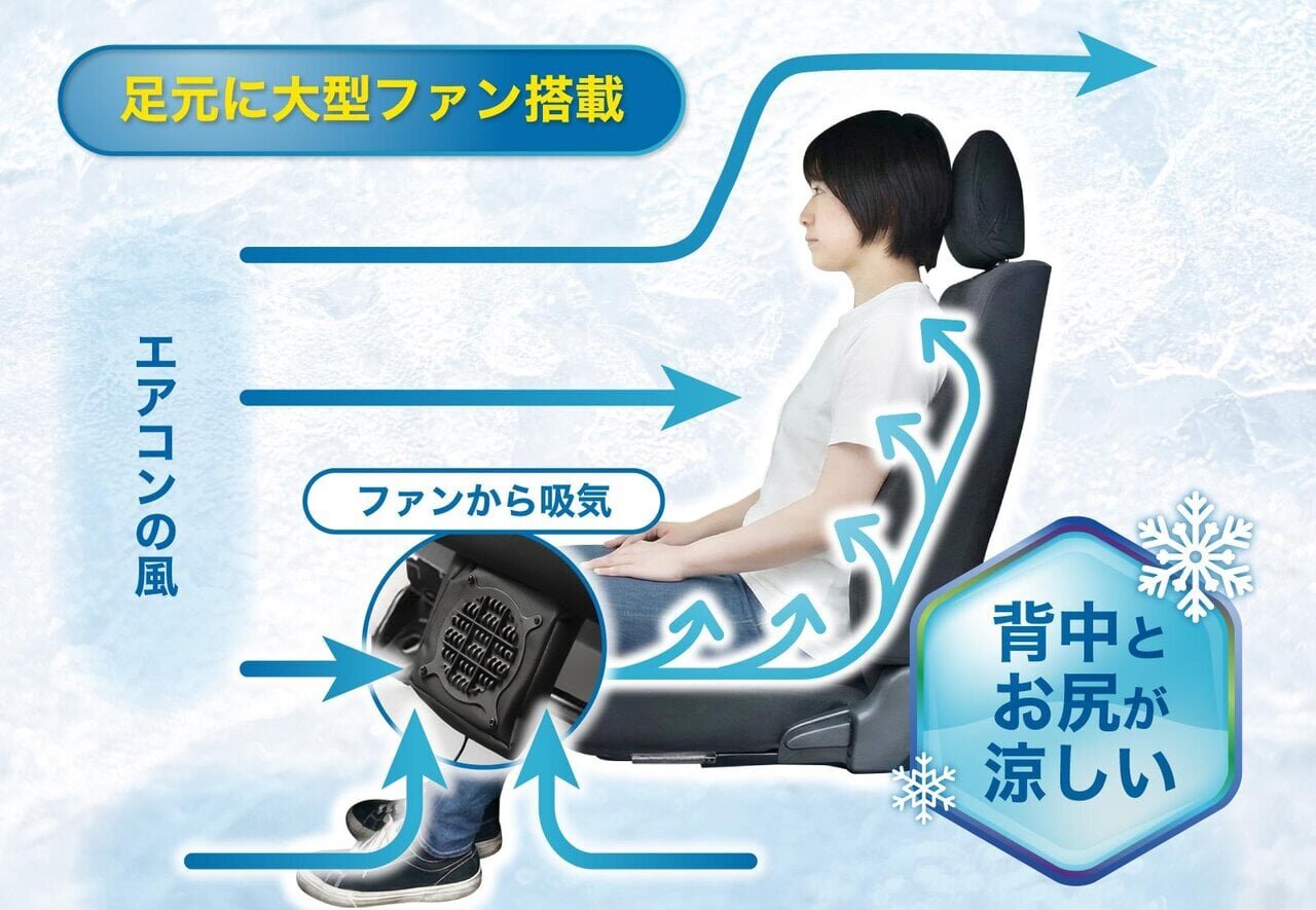 The large fan mounted at the bottom efficiently draws in this cool air and sends it through the air ducts inside the seat from the back to the seat cushion. With this design that utilizes air circulation within the car, you can experience a direct sense of coolness from the moment you sit down.