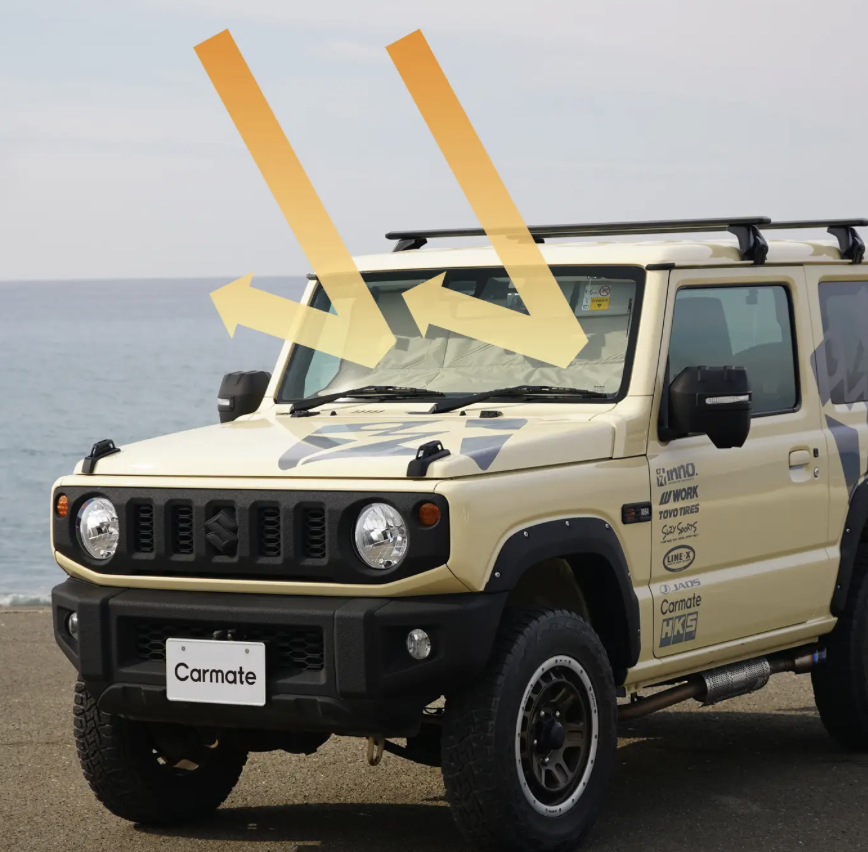 The Car Mate-developed "sun visor-mounted sunshade" is characterized by its non-use of suction cups. There are no marks left on the windshield, and there's no worry about the suction cups peeling off due to heat and the shade falling. The unique method of securing it using the original sun visor is a concept truly unique to a brand that fully understands the structure of the Jimny. Its ability to effectively block sunlight will surely become a trump card to deftly handle the scorching heat.
