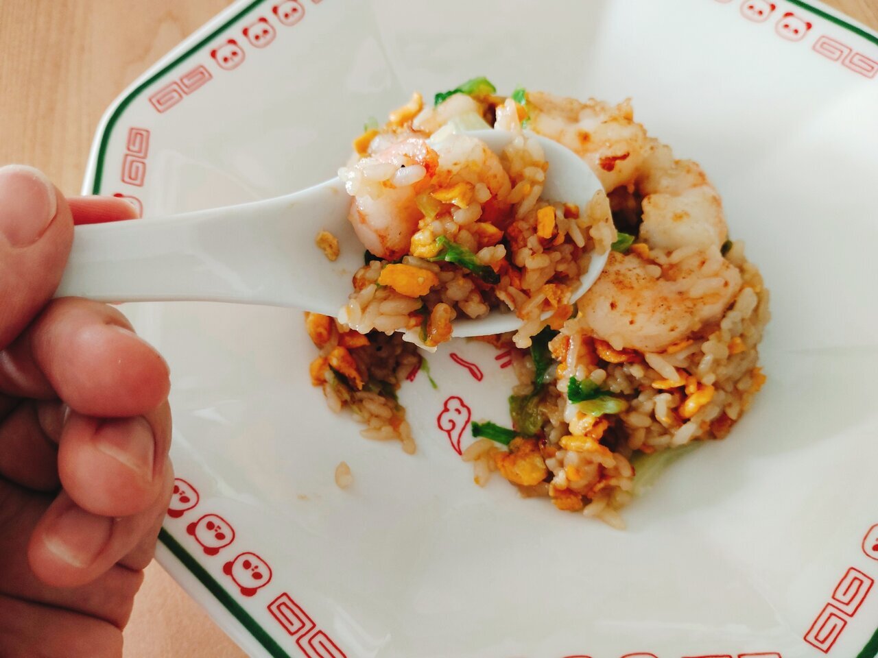 Ryuuji's "Supreme Lettuce Fried Rice" with large shrimp is complete!! The fried rice plate I had at home is too big, making it look like a small serving, but it actually has about 1.5 bowls worth.