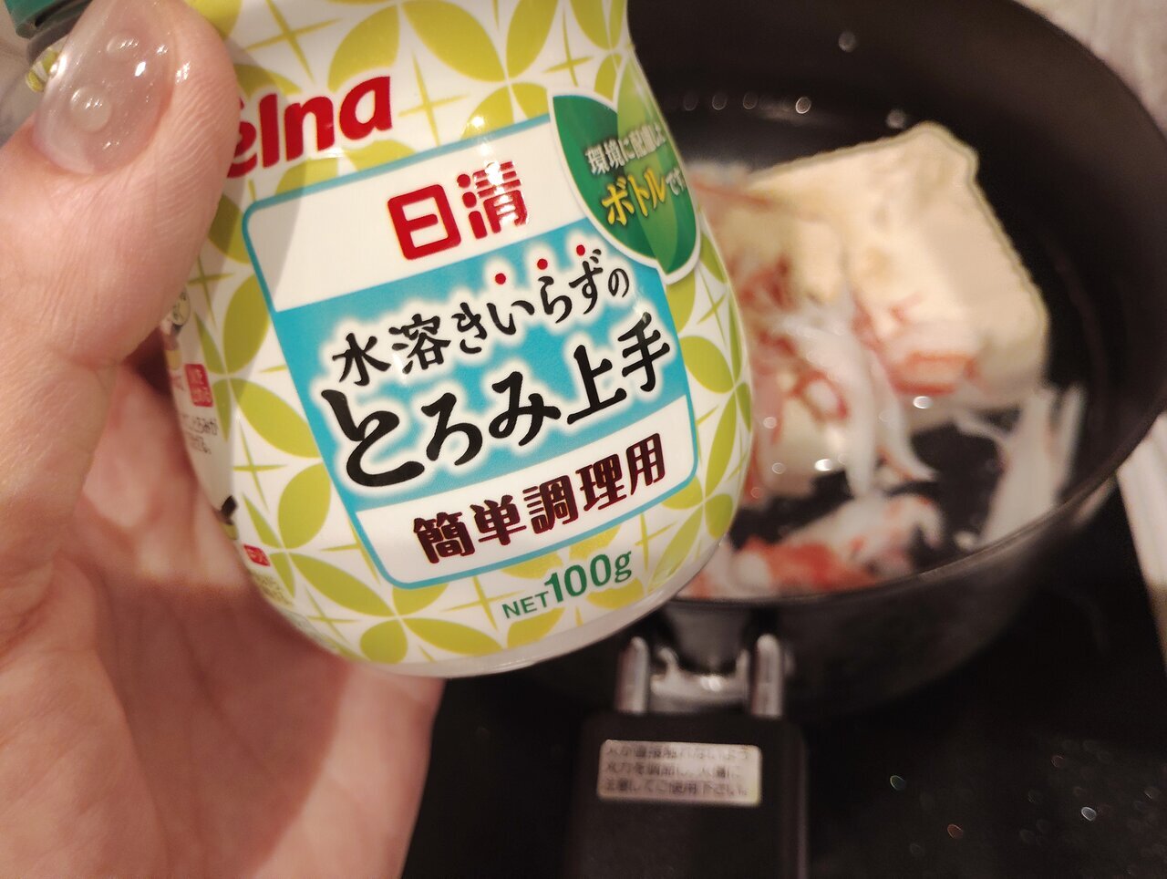 Add 200cc of water, 150g of whole silken tofu, and 40g of vertically shredded imitation crab meat to the pot.