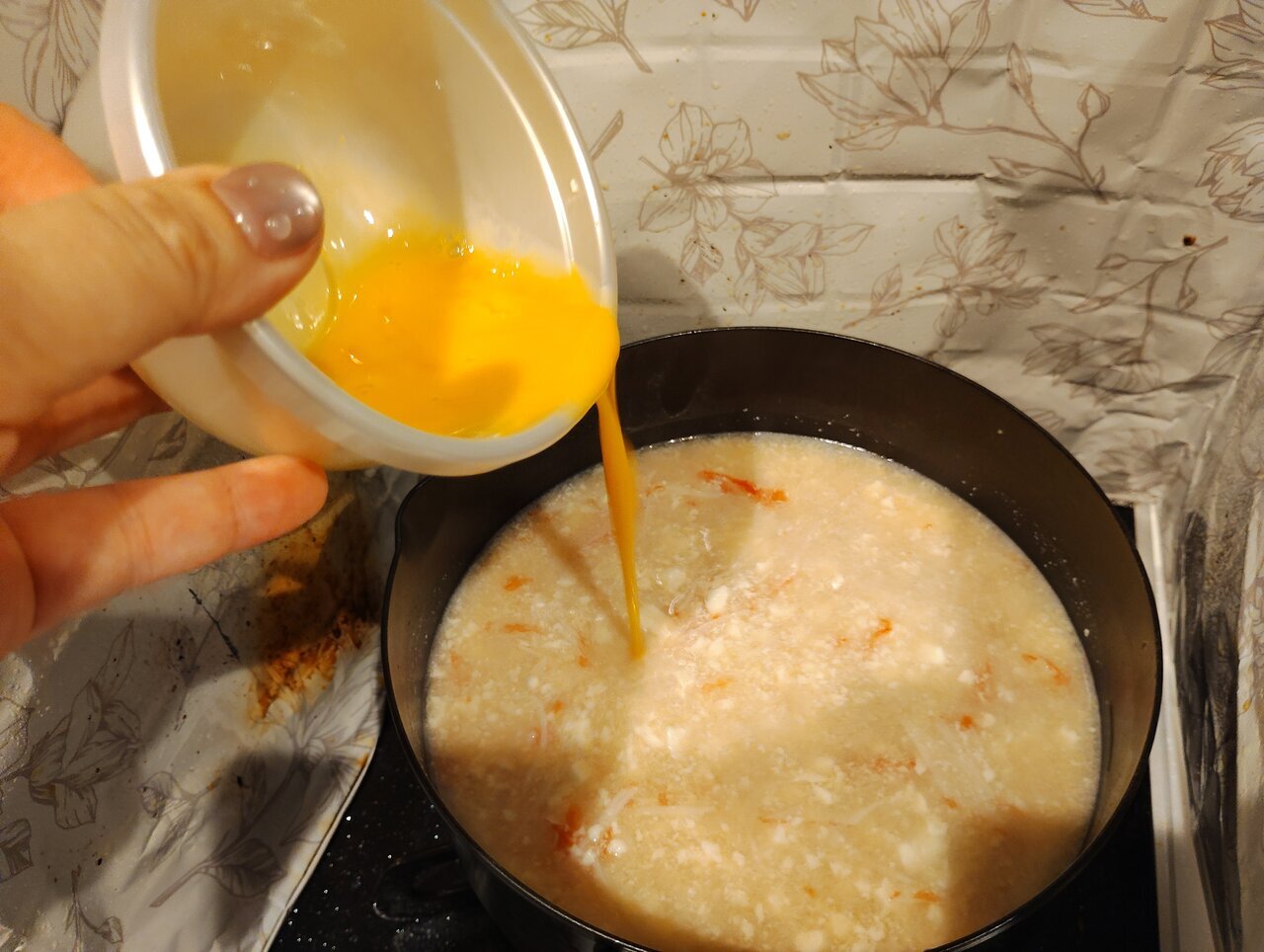Once it boils, turn off the heat, and add 1 beaten egg. Reheat and drizzle in 1 teaspoon of sesame oil to enhance the flavor and richness.